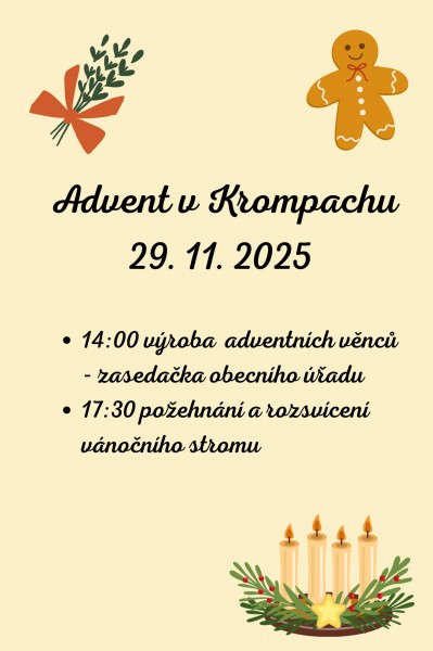 Nezapomeňte, že v sobotu 30.11.2013 se od 17:45 bude na krompašské návsi rozsvěcet vánoční stromeček. Pan farář stromek požehná a společně si zazpíváme koledy. Pak následuje již tradiční sousedské posezení s malým předvánočním občerstvením, na které všechny zveme. Přijďte načerpat klid a sousedskou pohodu nadcházejících Vánoc.